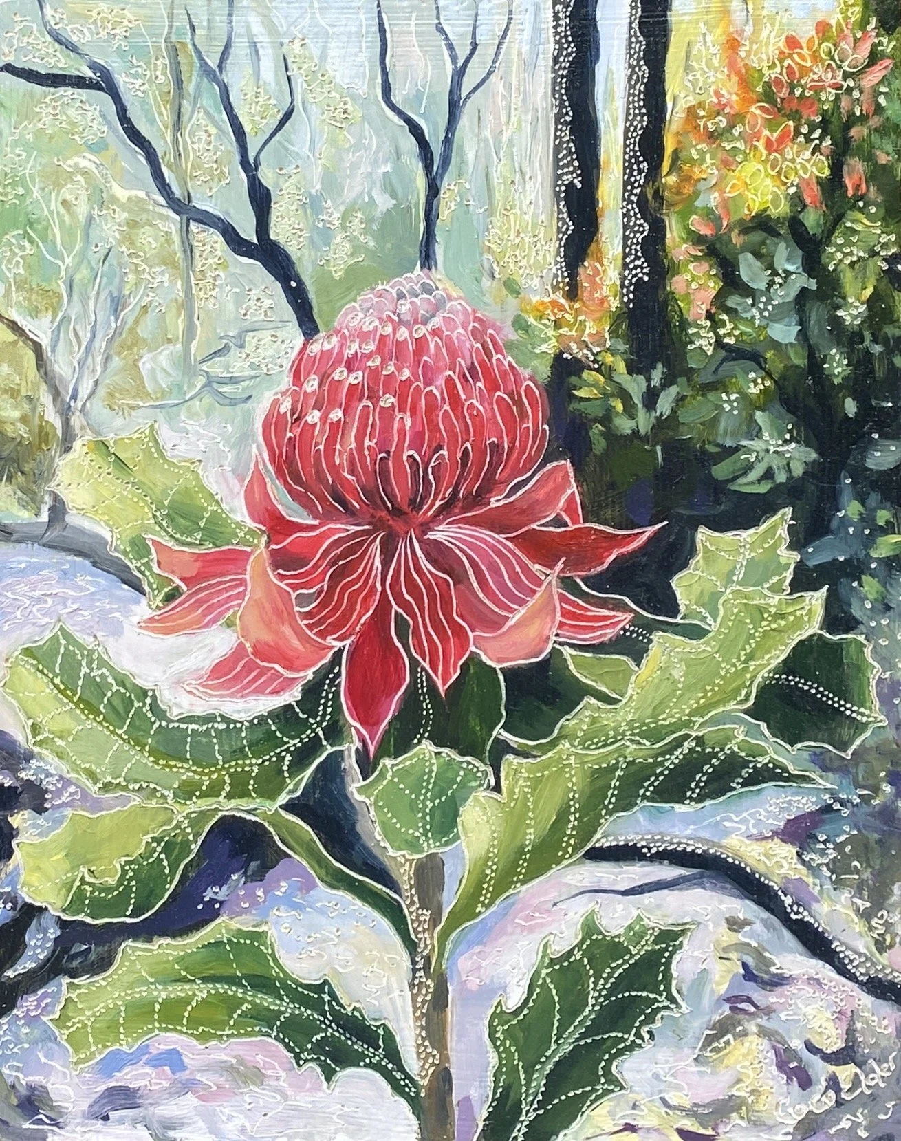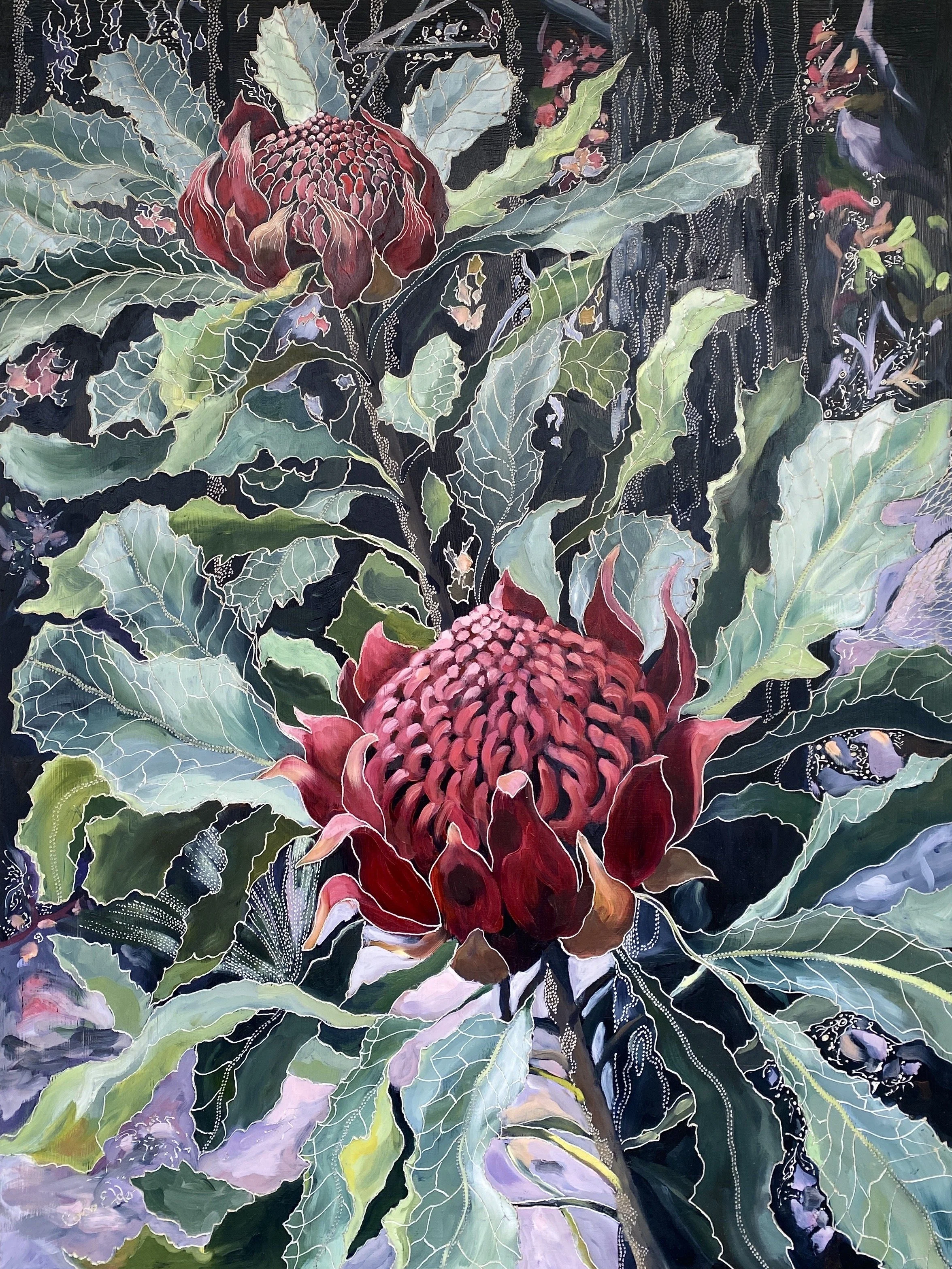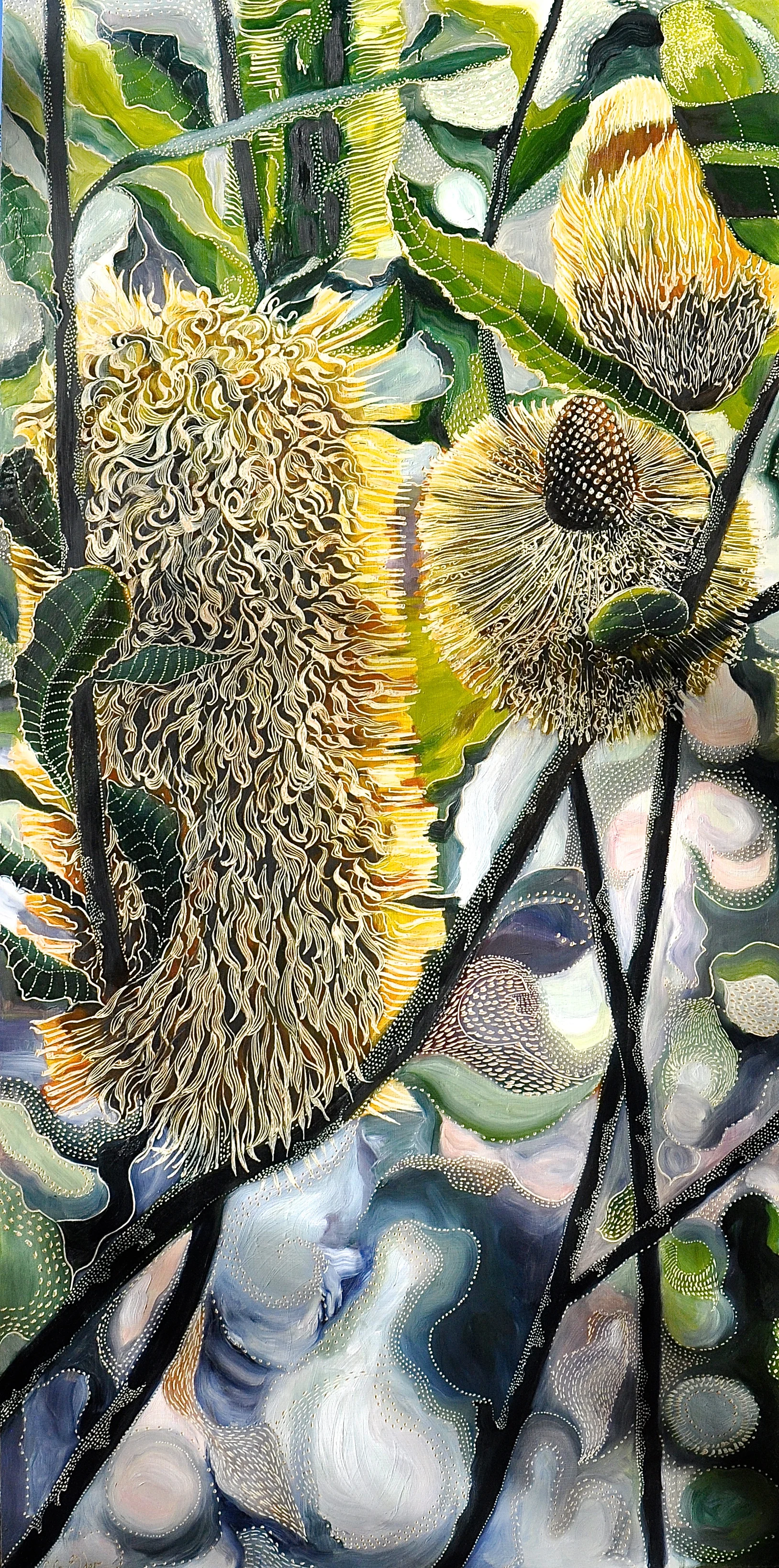 Alternate Pathways at the Never Never Medium: 93H x 154W cm Dimensions: Oil on Board Carved