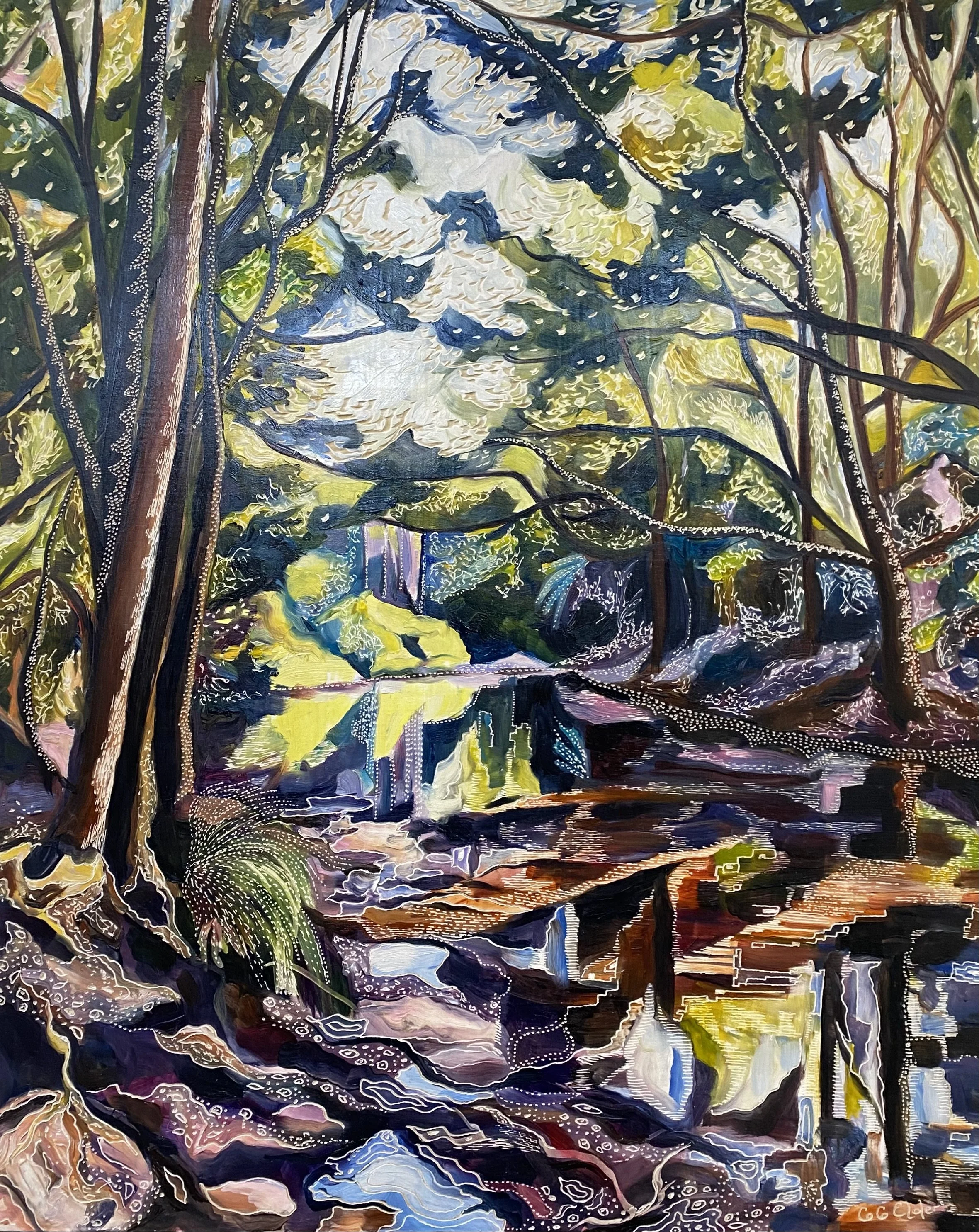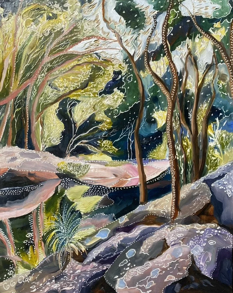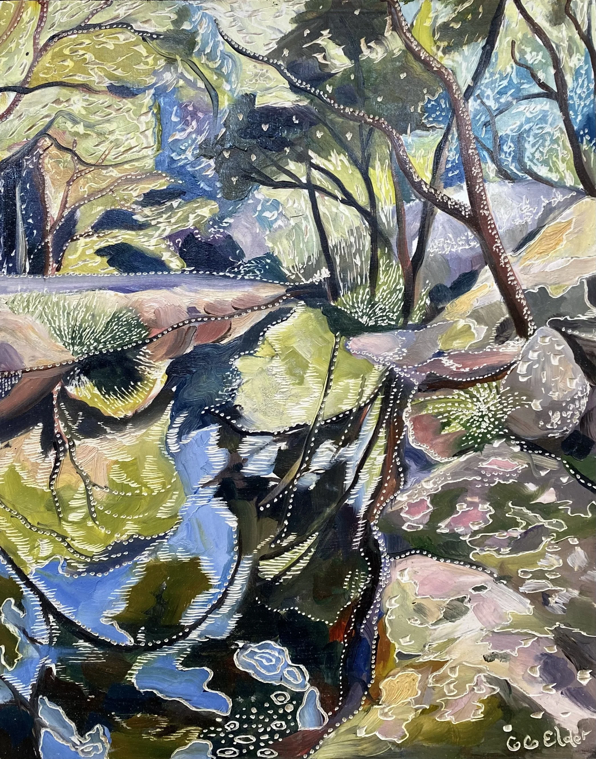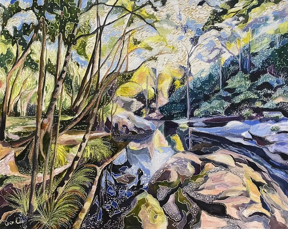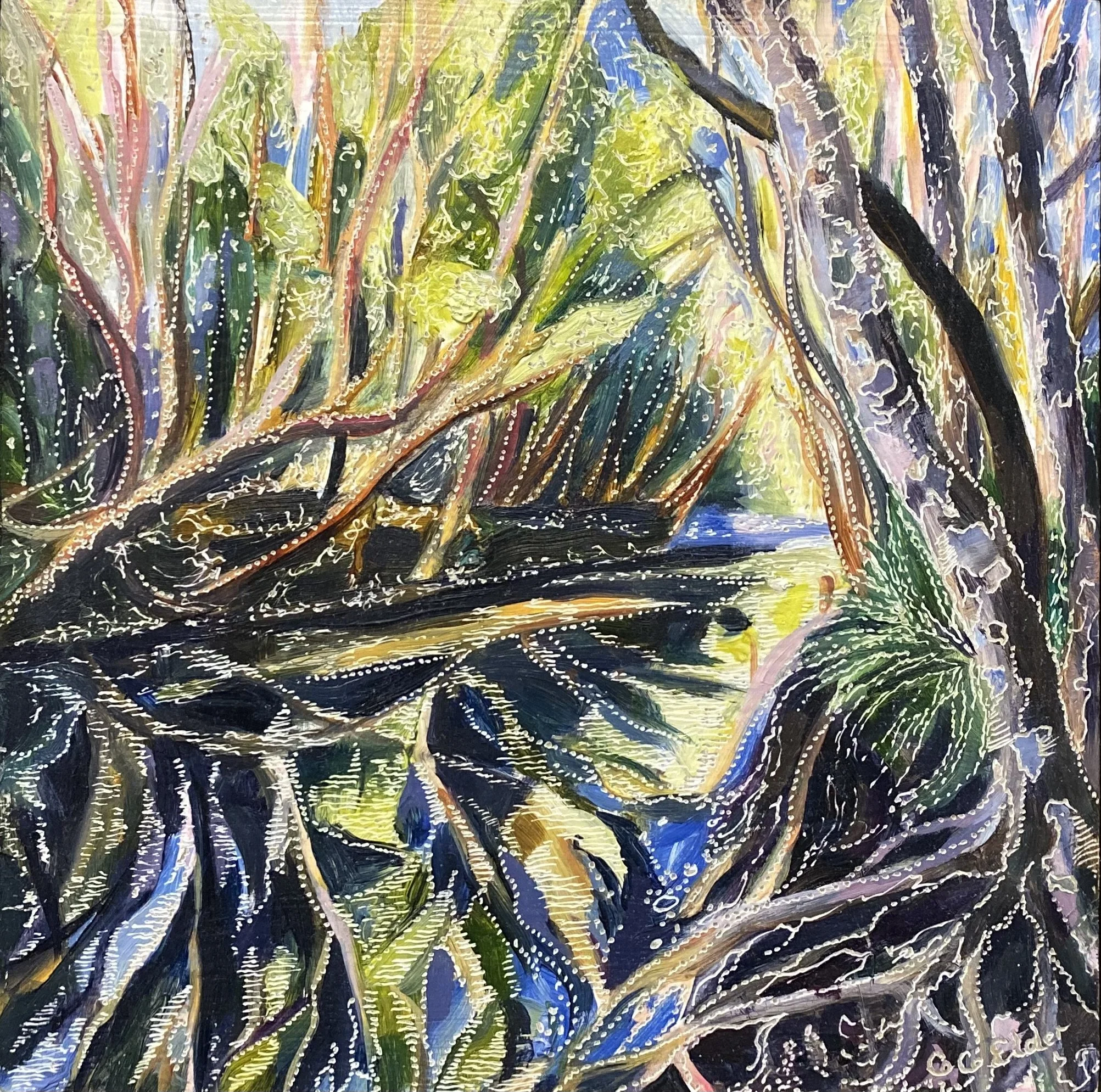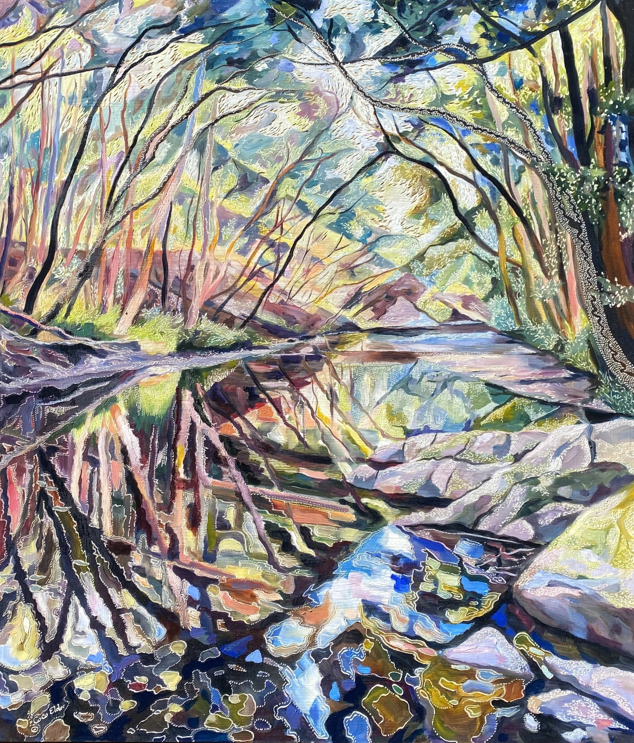 Building up forms of colour and simplifying the landscape into geometrical forms from observations of shadow and light initiates the process of oil painting on board. The subject comes to life with textural overlays & patterns that link geometrical forms in nature with her playful & spontaneous carving process. This eclectic contemporary practice allow her to bridge her initial love of drawing with painting.