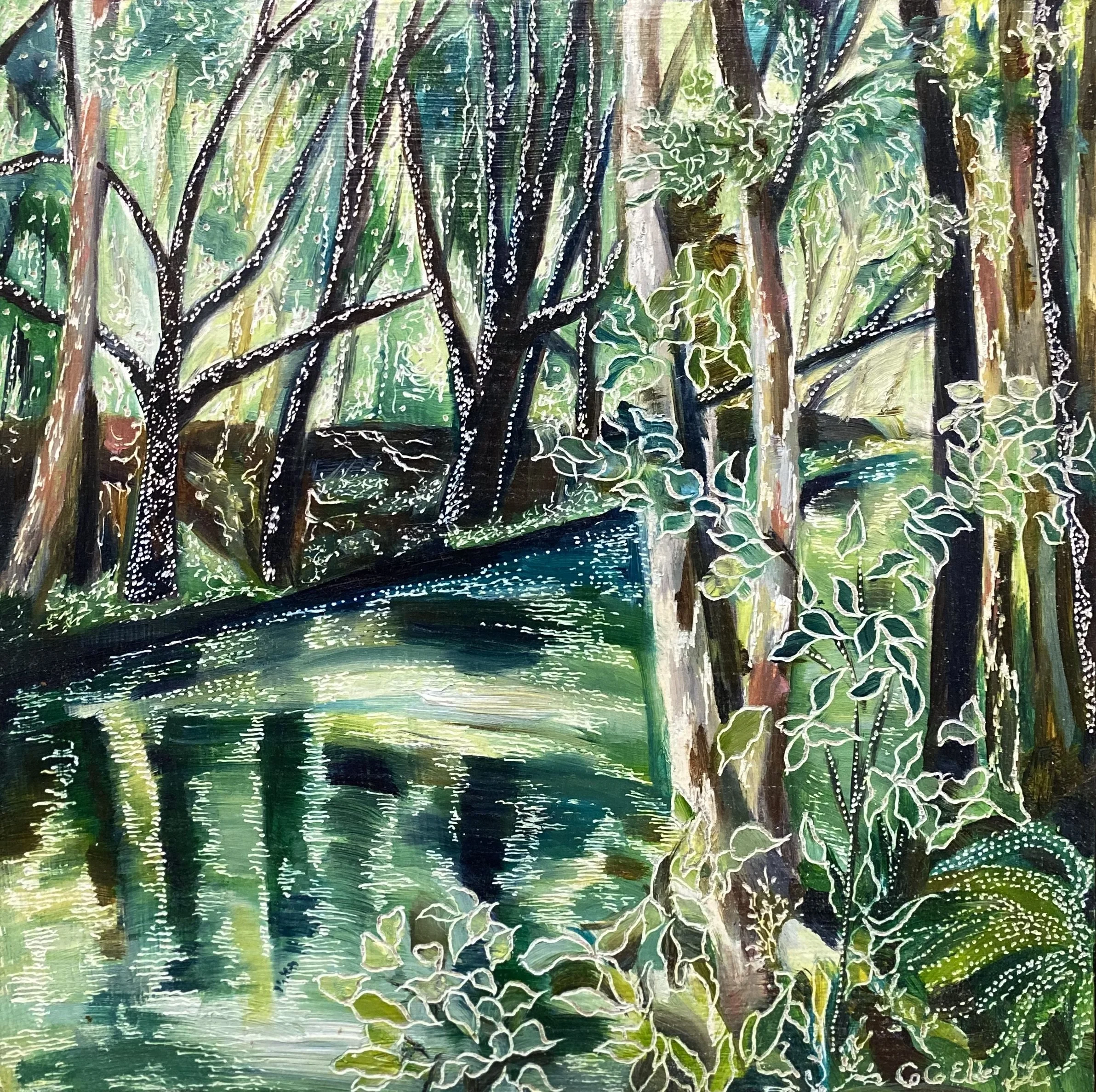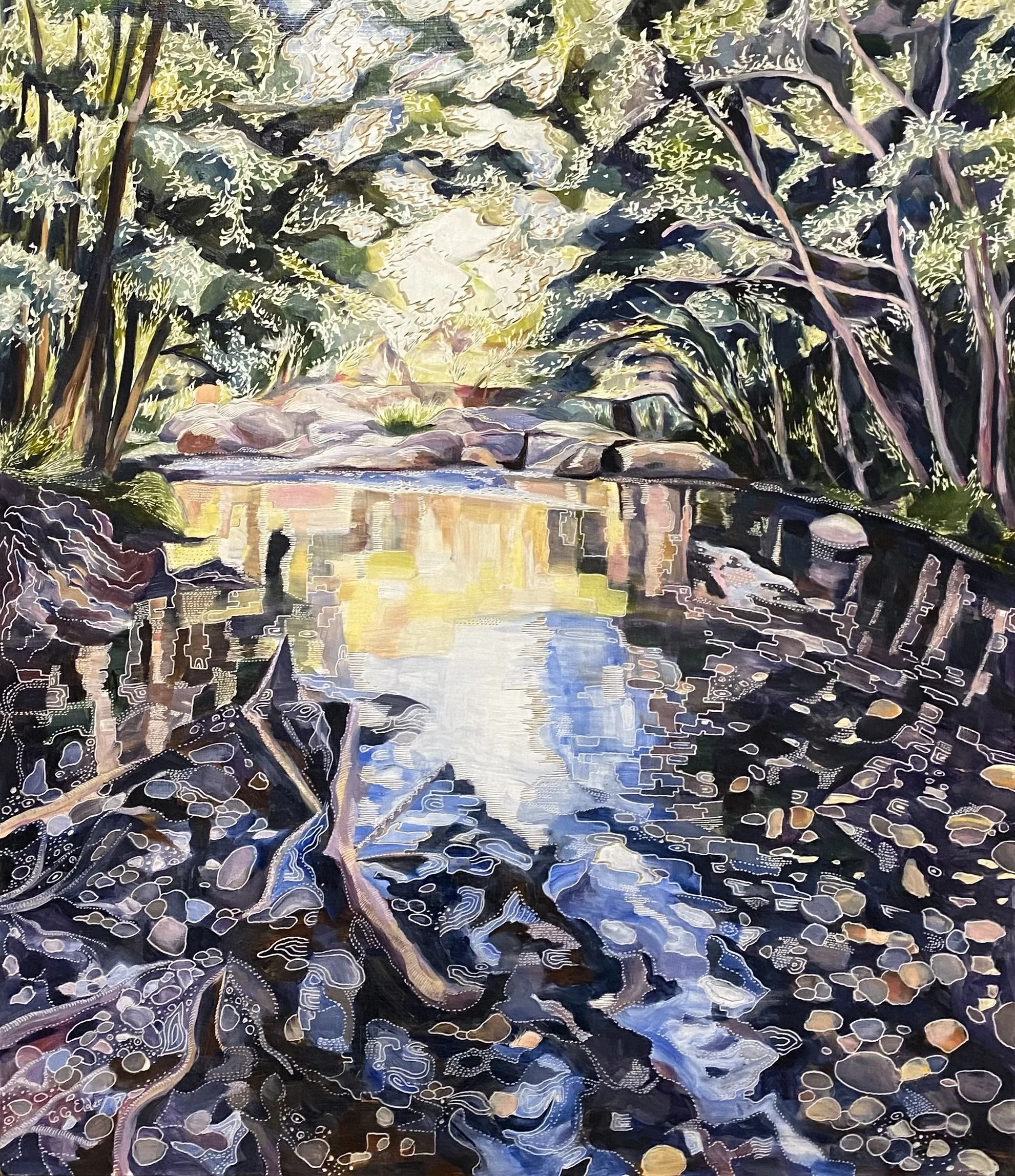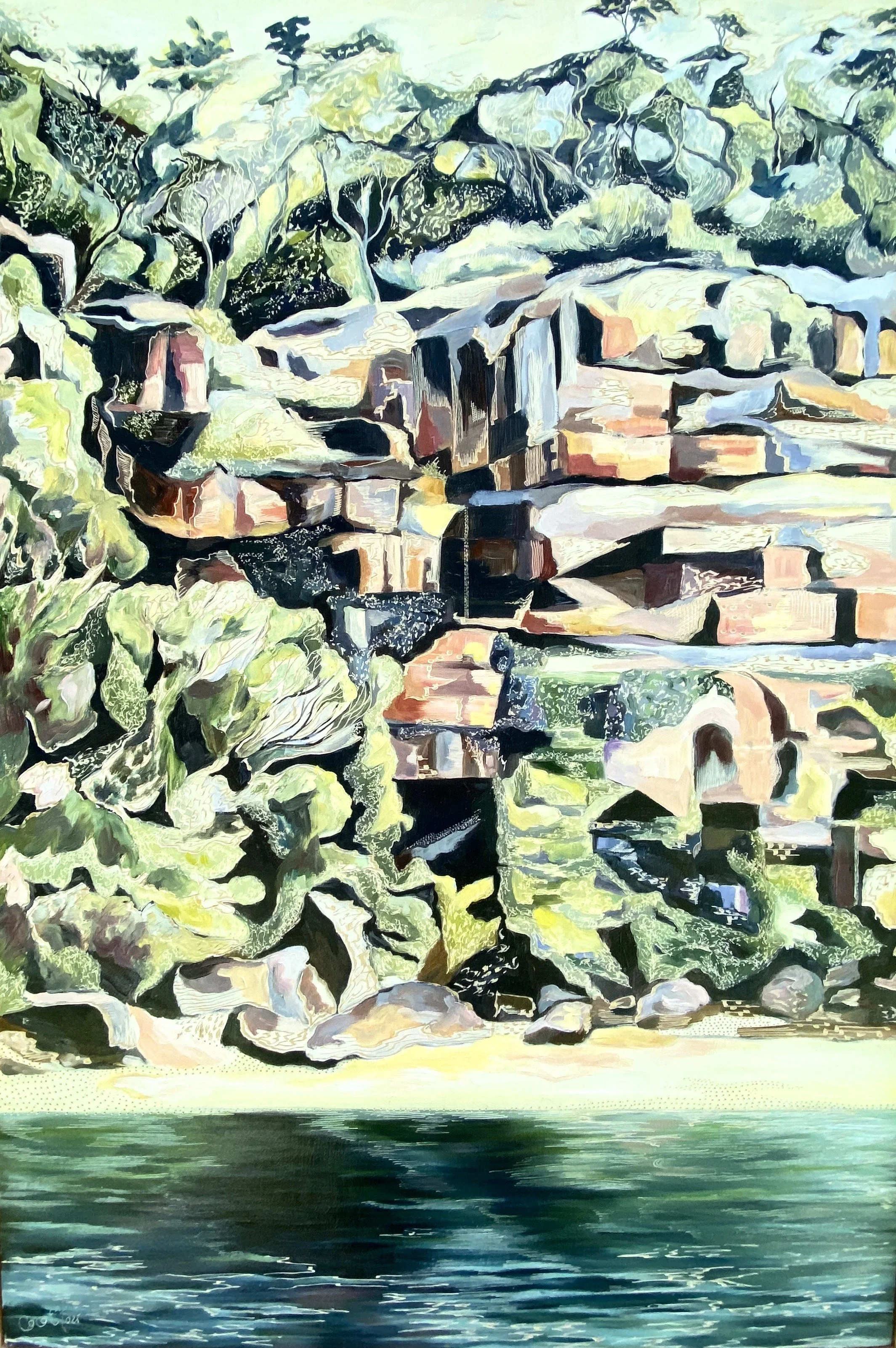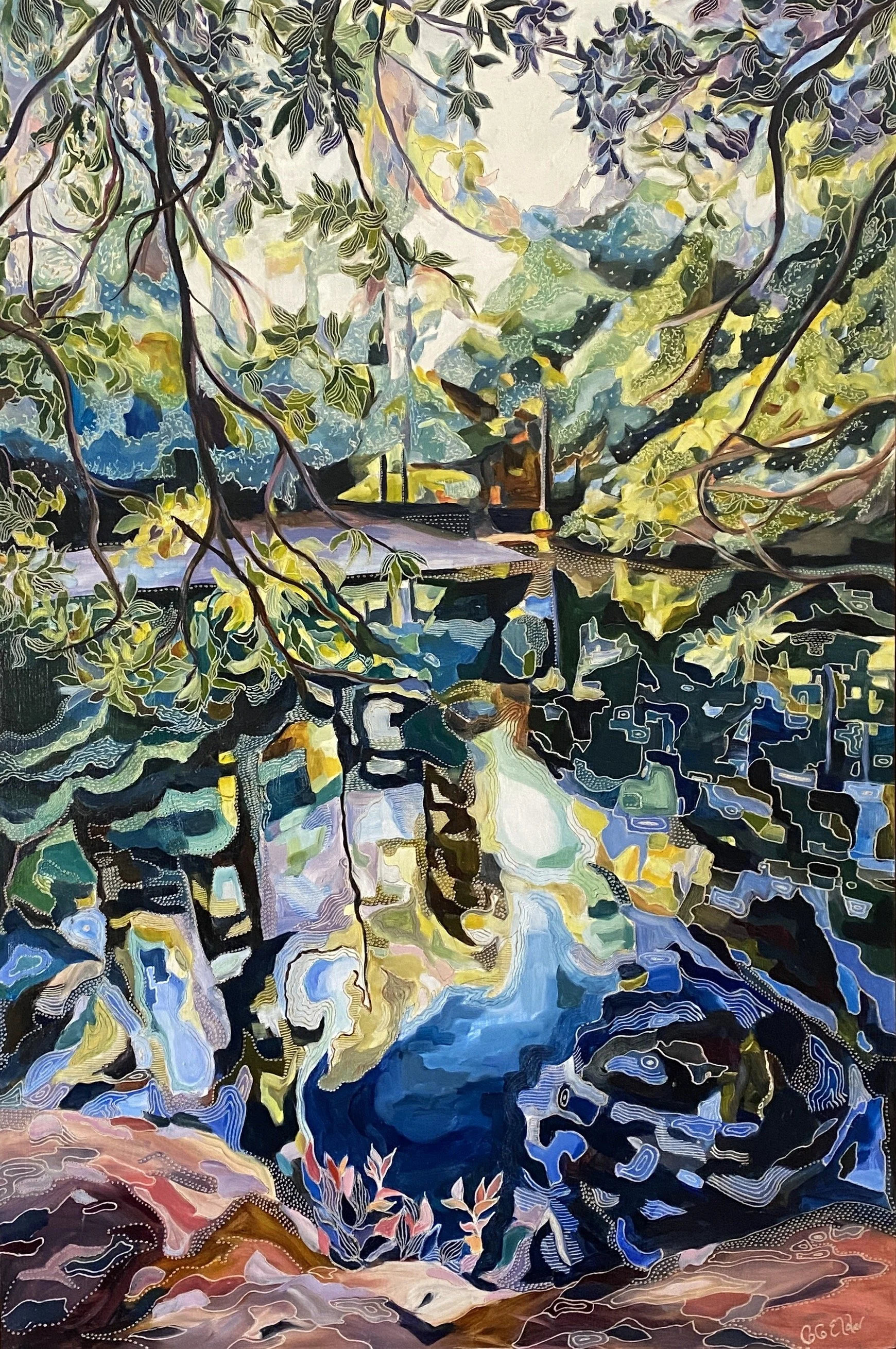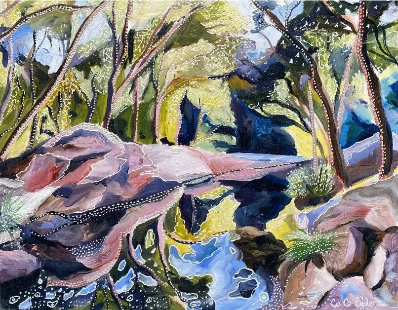 Building up forms of colour and simplifying the landscape into geometrical forms from observations of shadow and light initiates the process of oil painting on board. The subject comes to life with textural overlays & patterns that link geometrical forms in nature with her playful & spontaneous carving process. This eclectic contemporary practice allow her to bridge her initial love of drawing with painting.