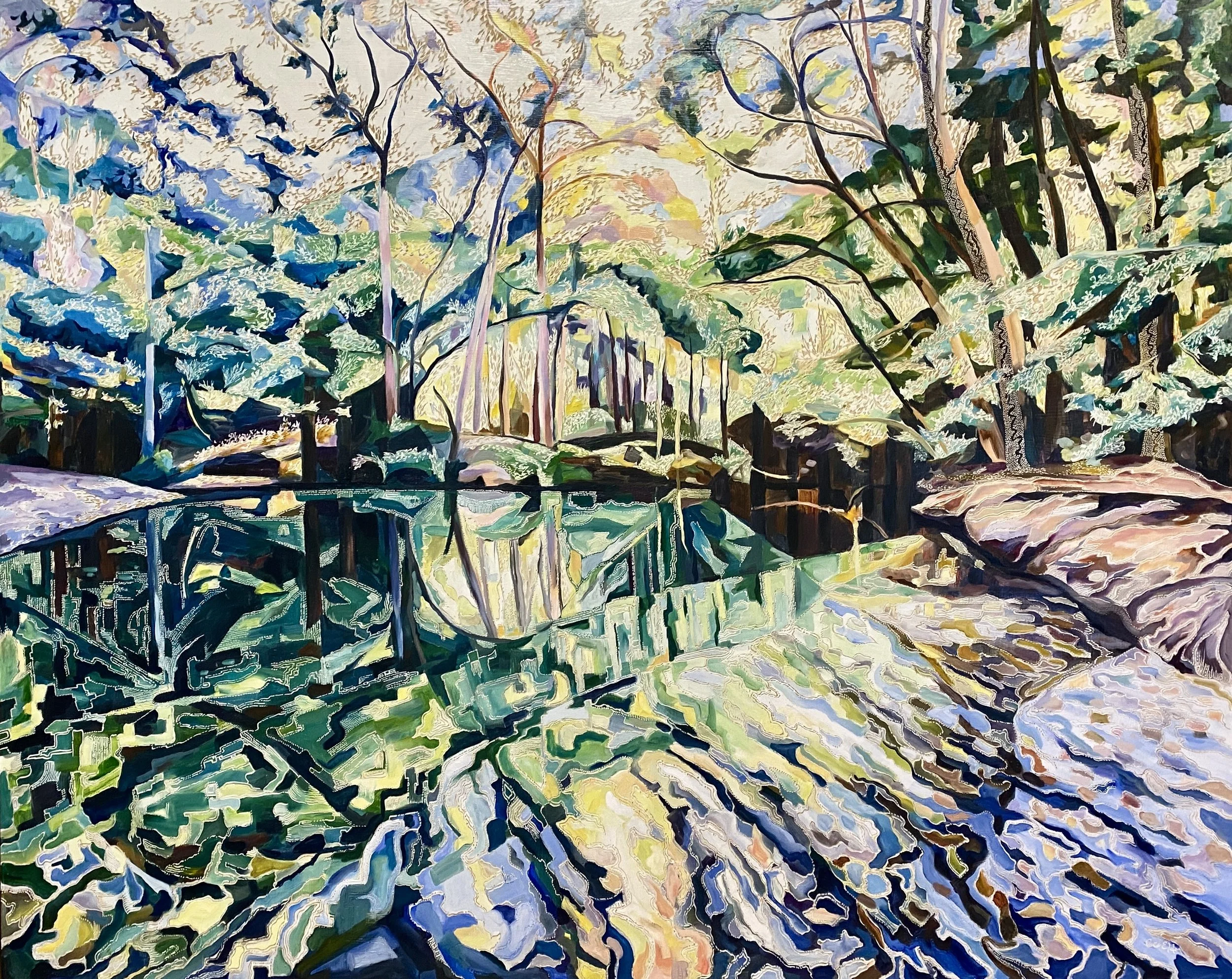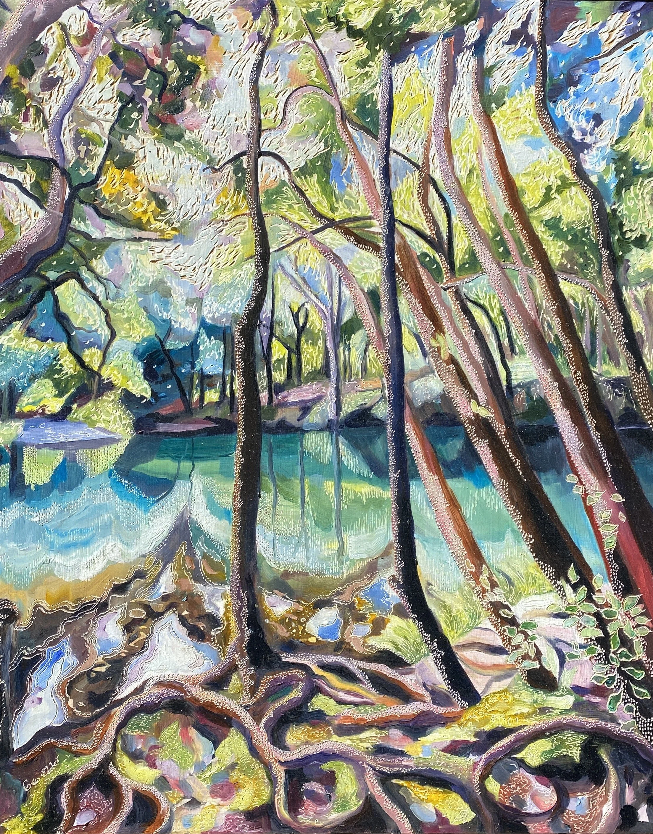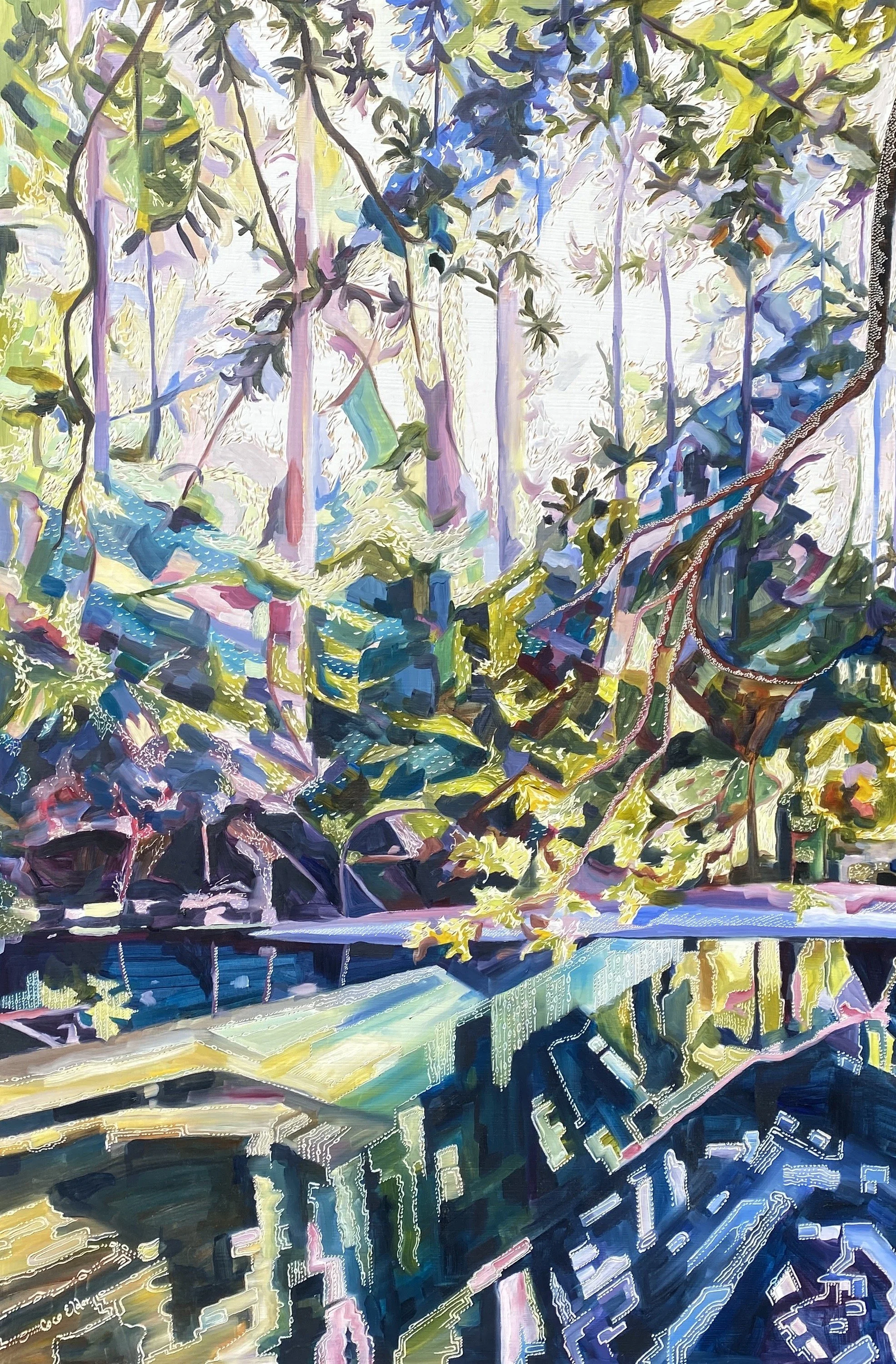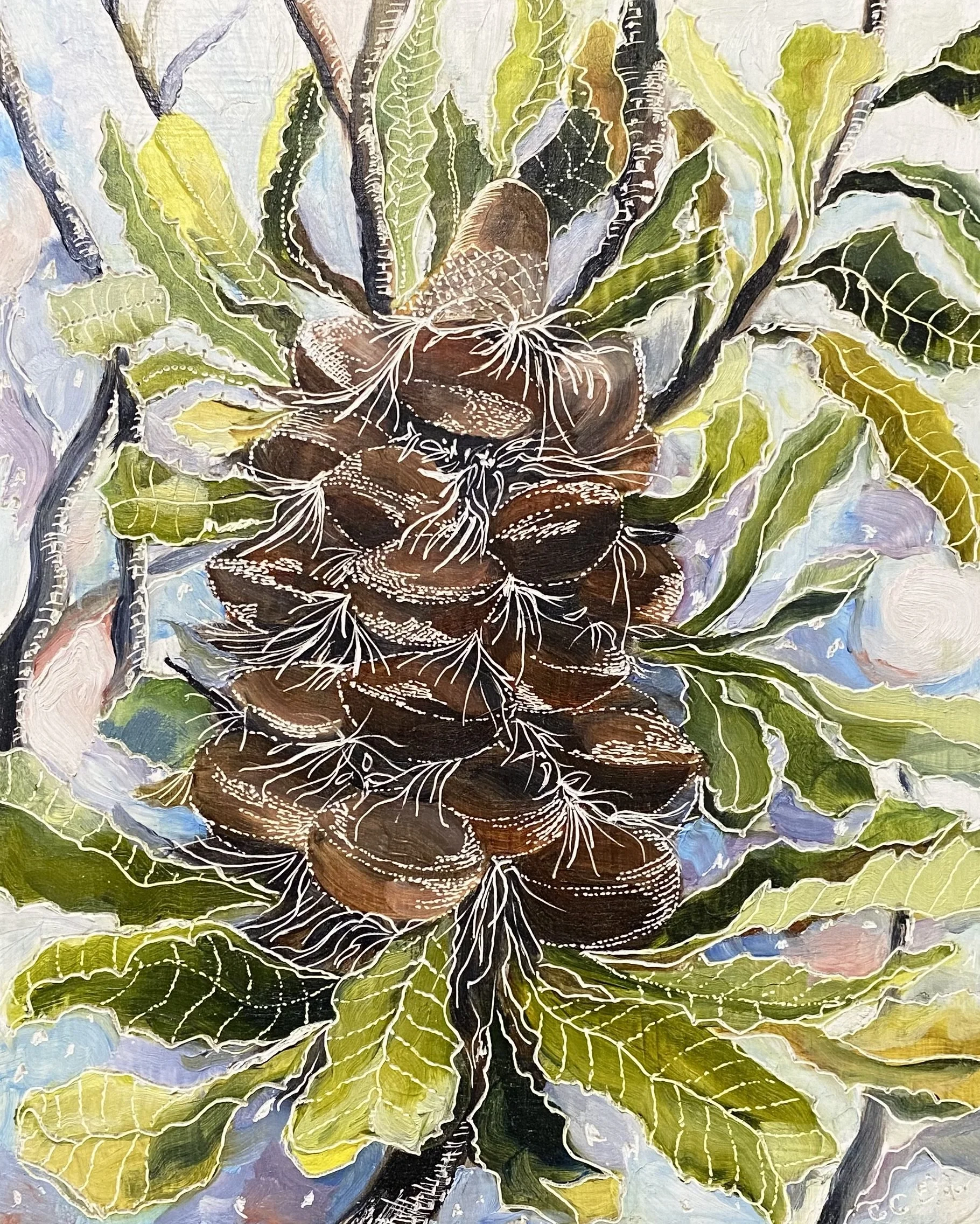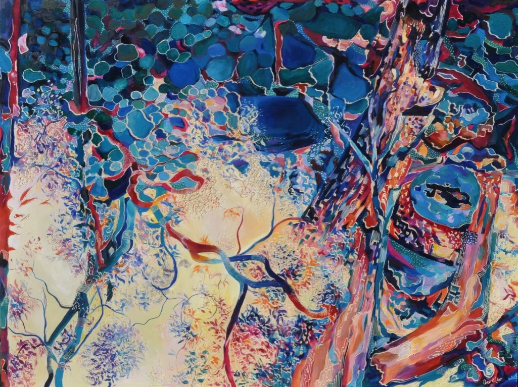 Building up forms of colour and simplifying the landscape into geometrical forms from observations of shadow and light initiates the process of oil painting on board. The subject comes to life with textural overlays & patterns that link geometrical forms in nature with her playful & spontaneous carving process. This eclectic contemporary practice allow her to bridge her initial love of drawing with painting.