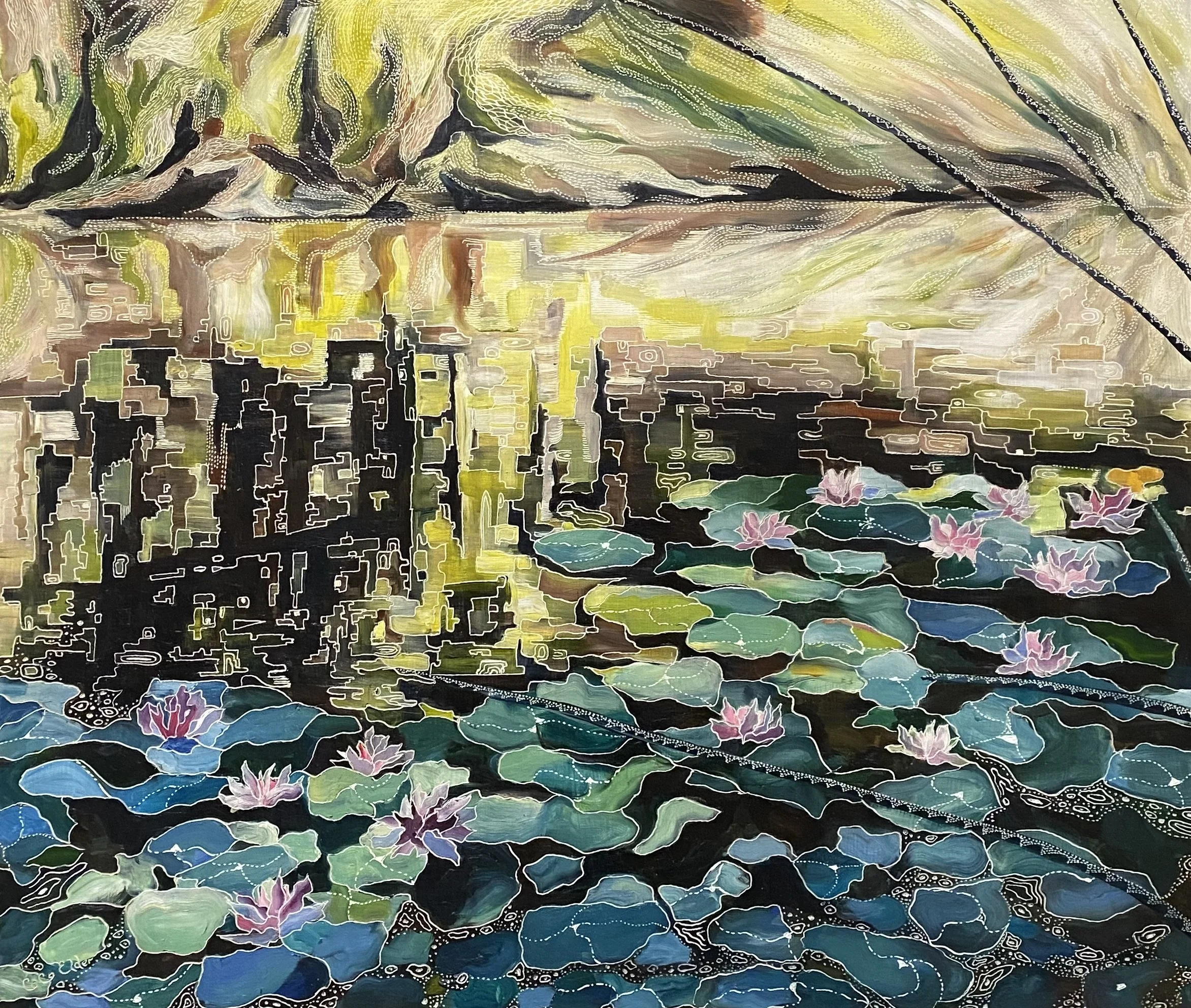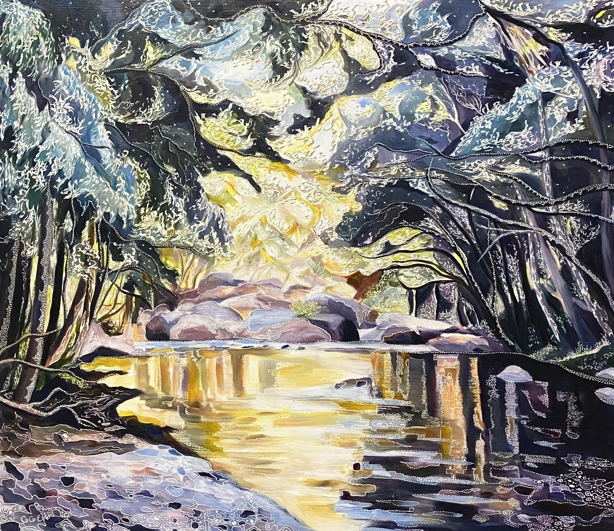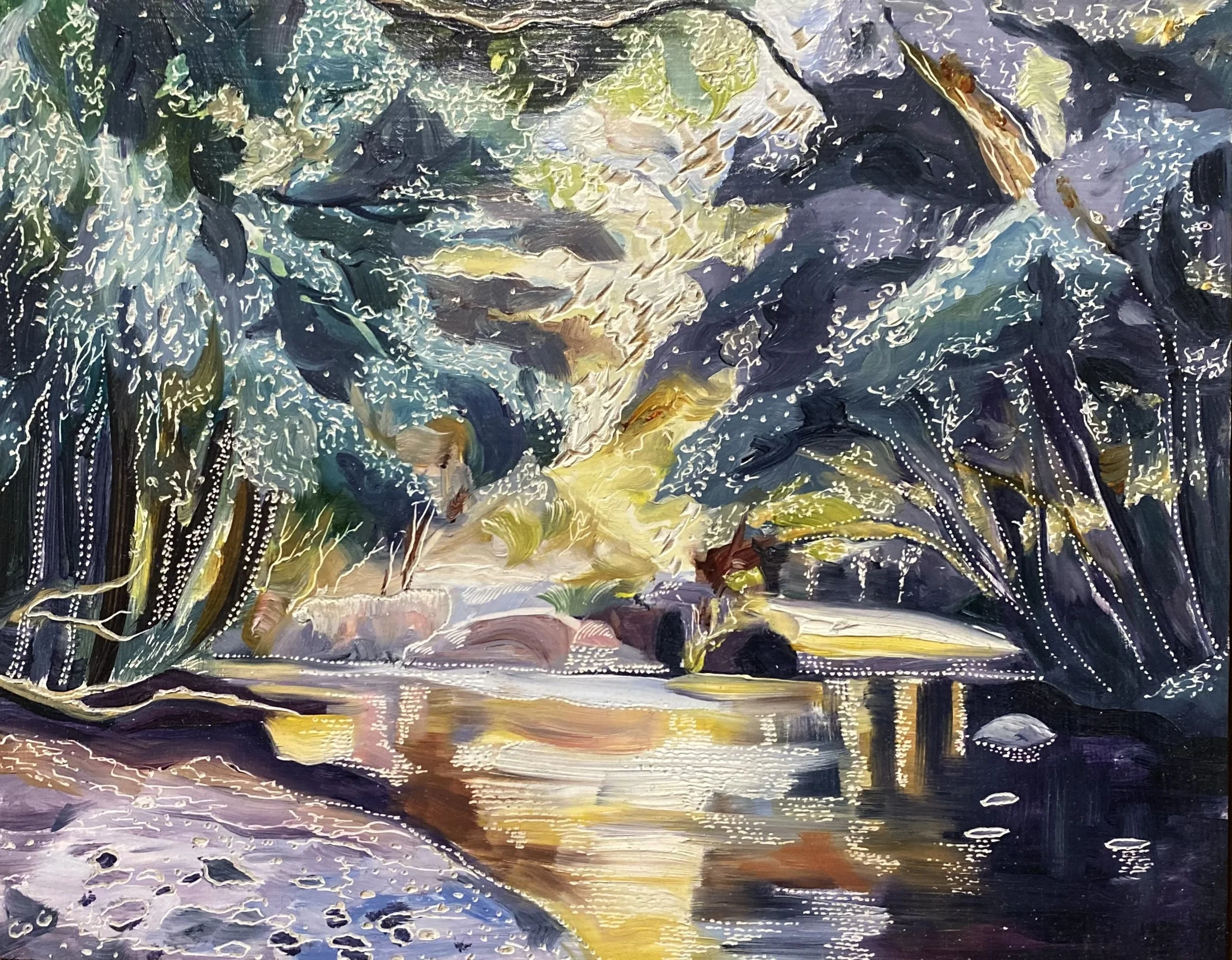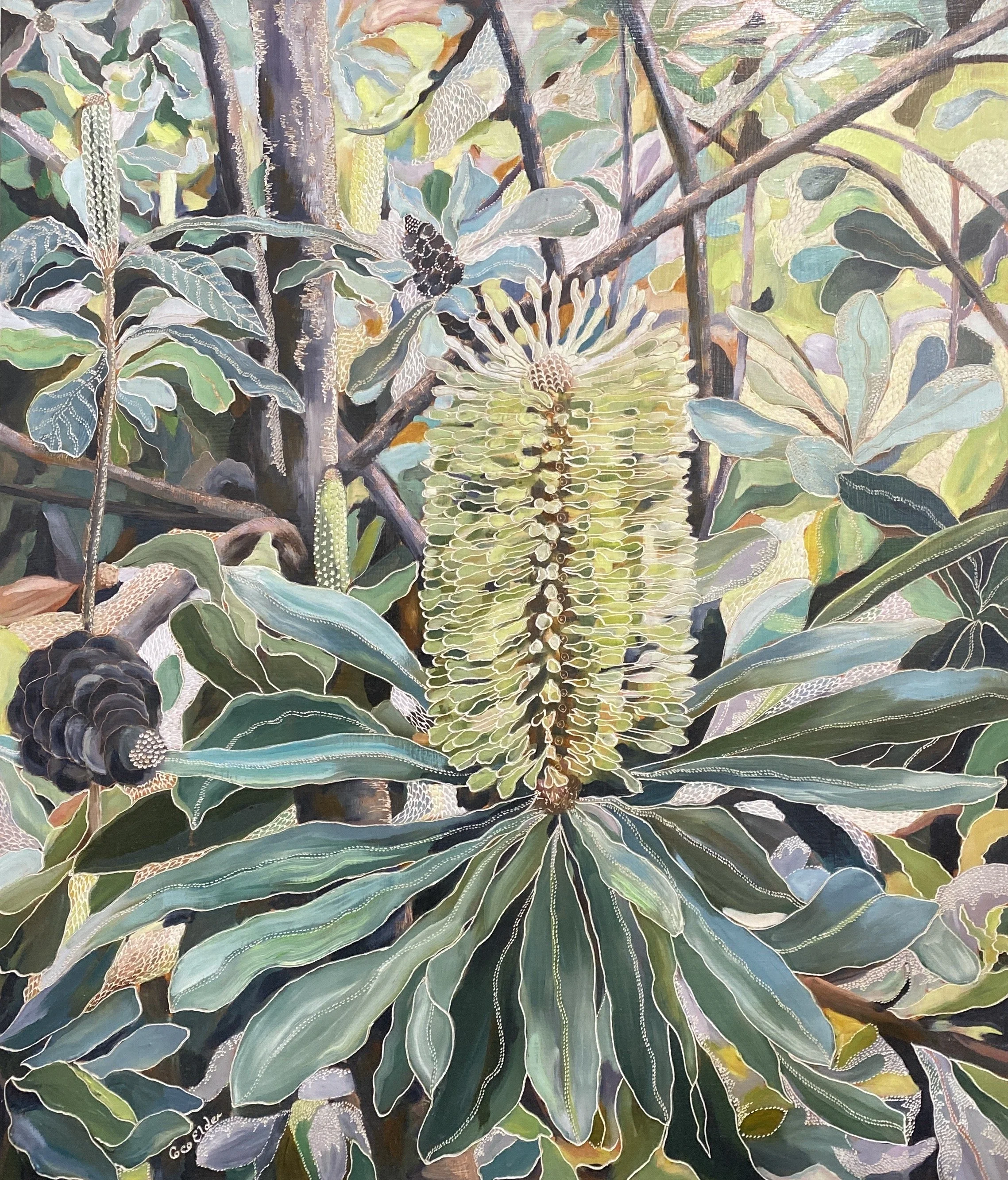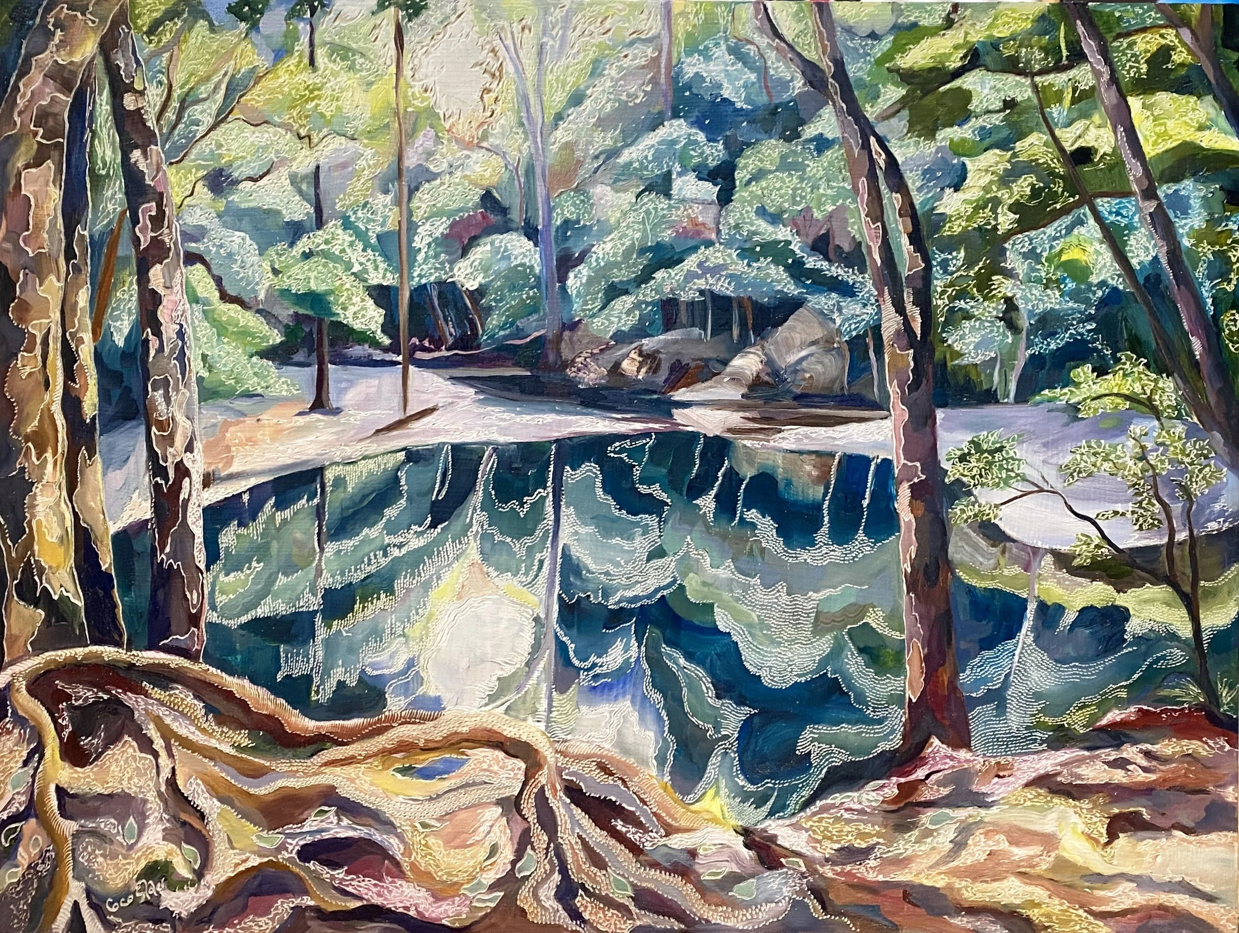 Building up forms of colour and simplifying the landscape into geometrical forms from observations of shadow and light initiates the process of oil painting on board. The subject comes to life with textural overlays & patterns that link geometrical forms in nature with her playful & spontaneous carving process. This eclectic contemporary practice allow her to bridge her initial love of drawing with painting.