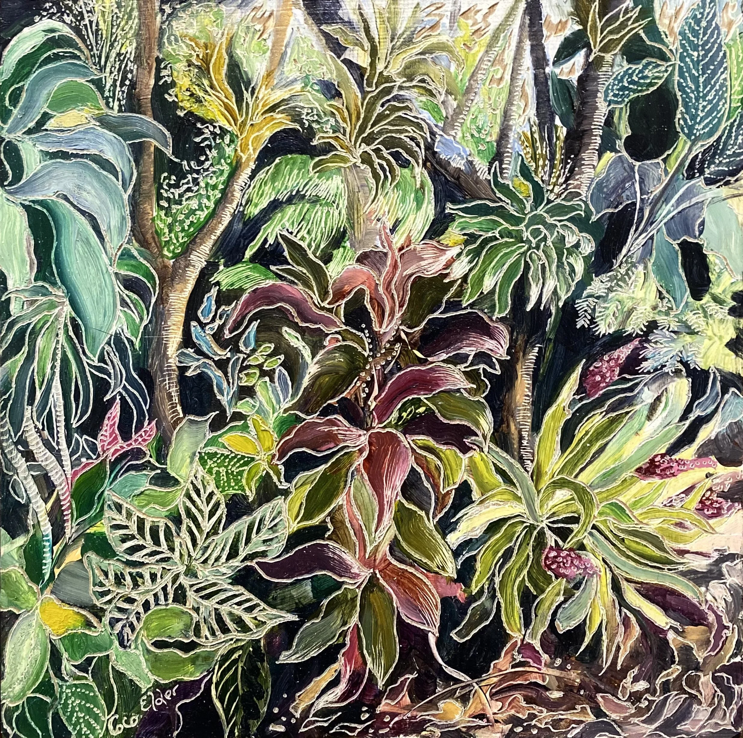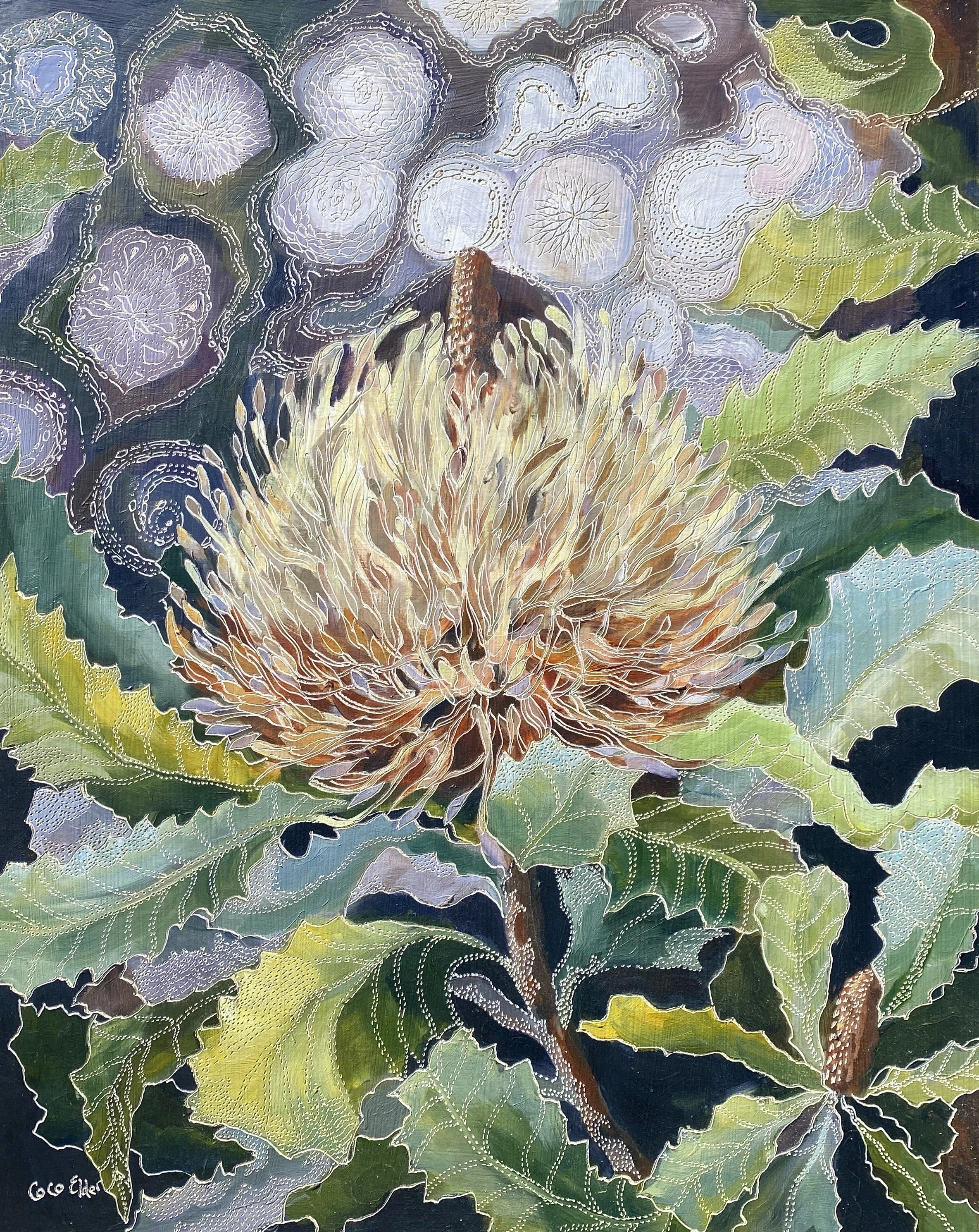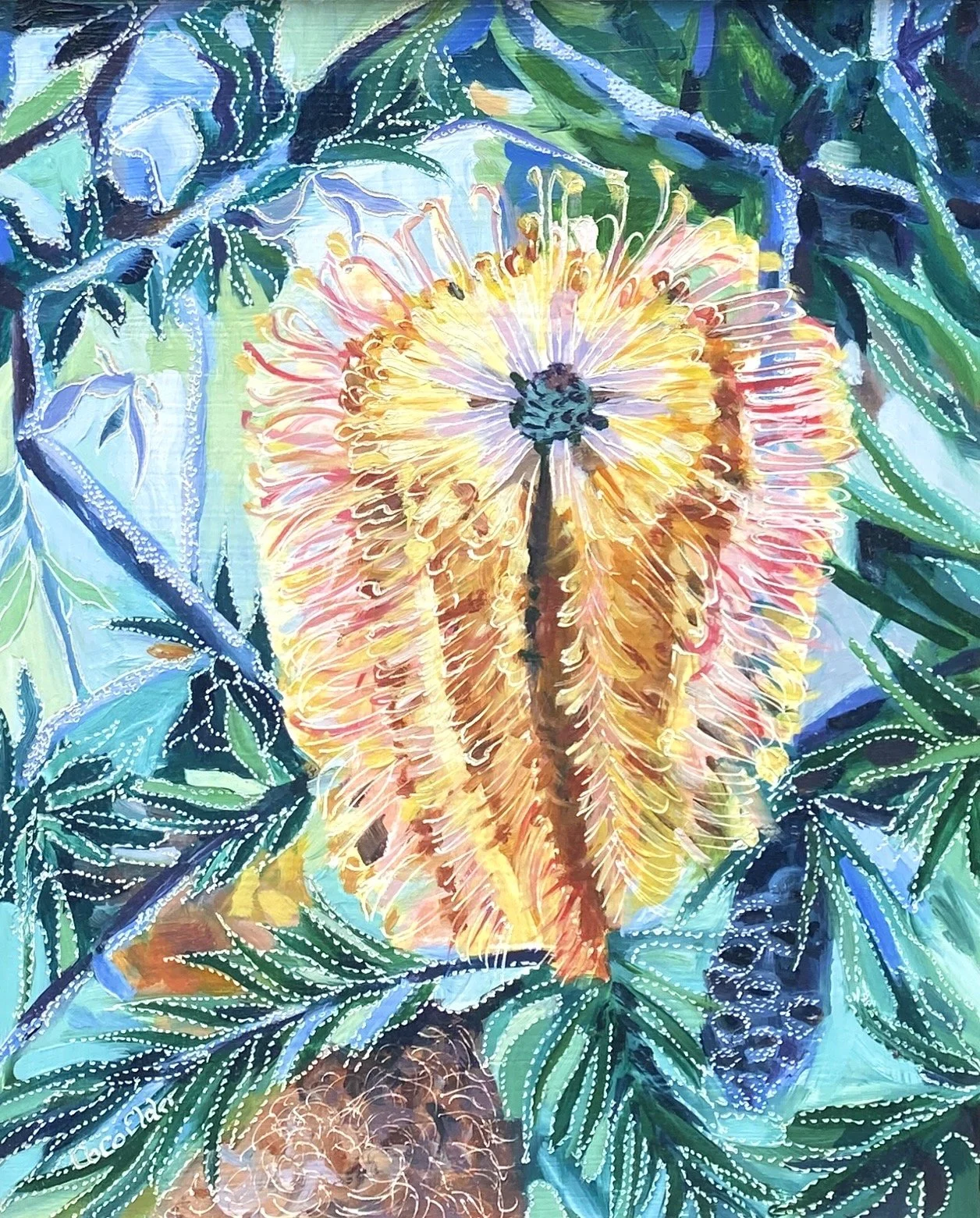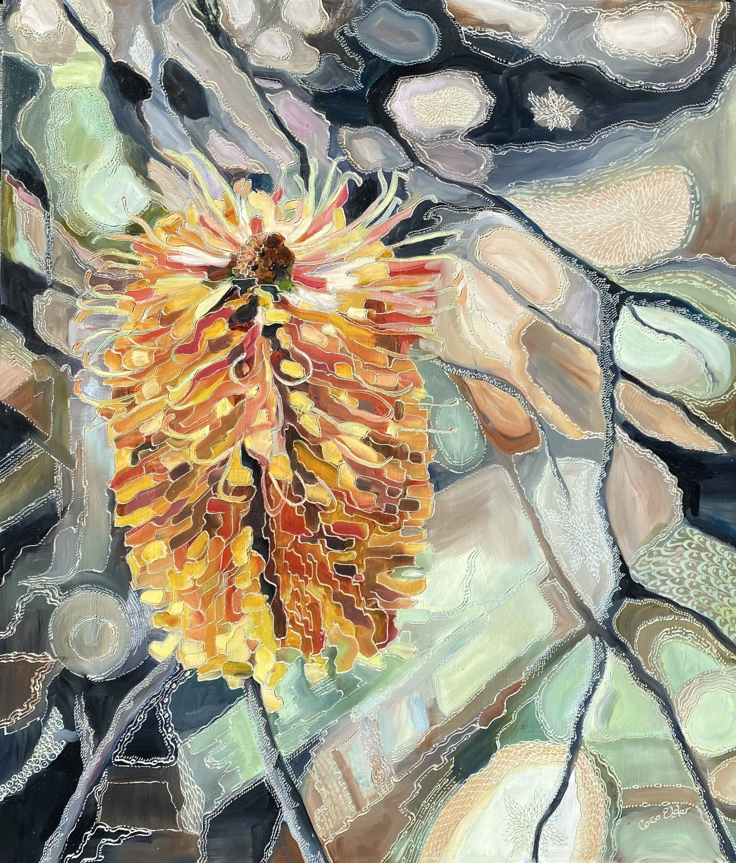 Coco’s unique process of carving into the oil paint initiated from an experiment that she did when she was seeking a way to incorporate another layer via gestural mark making with her paint. Inspired both by her early interest in lino carving and later watching her father carve into a wooden screen using a chain saw, Coco sought a more achievable approach using an engraving tool.