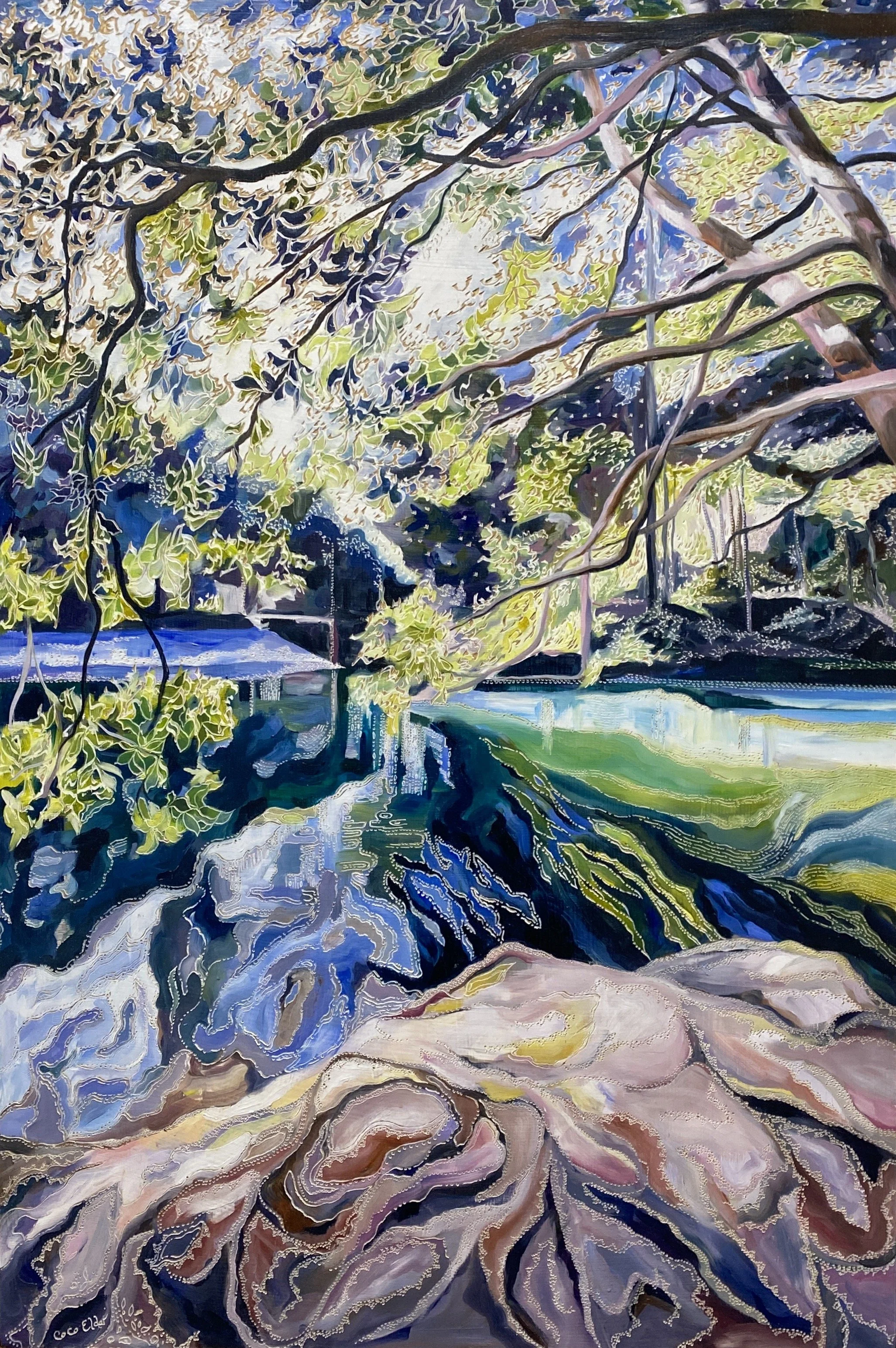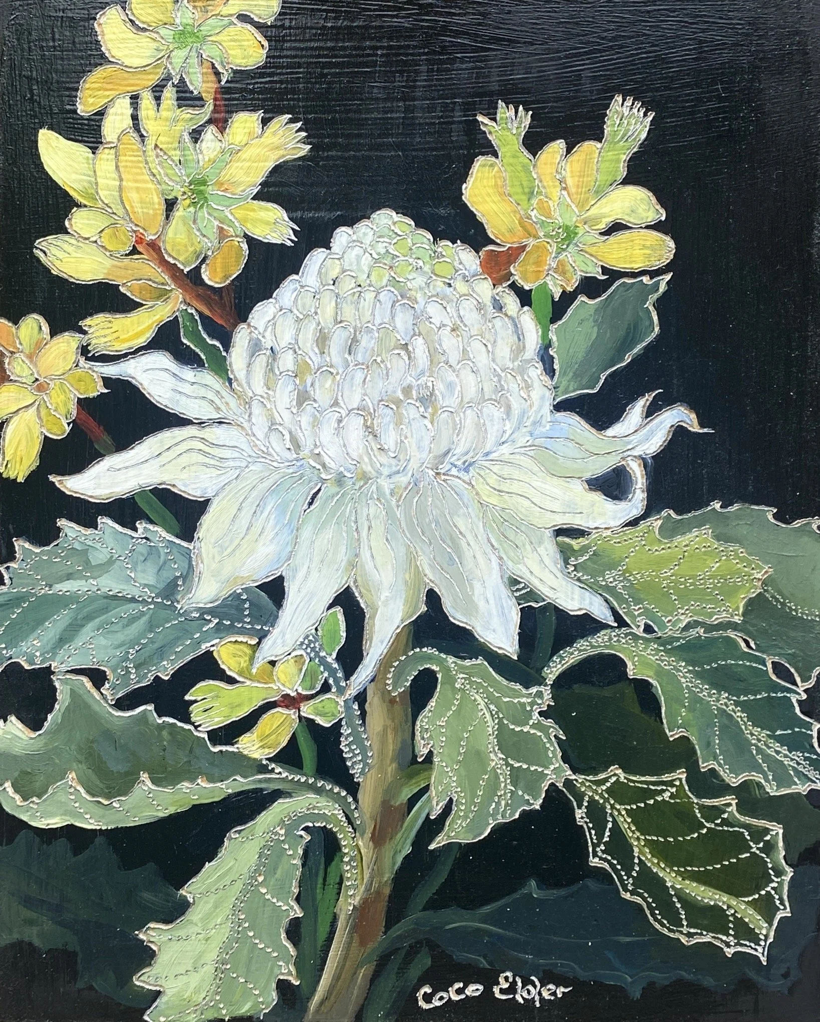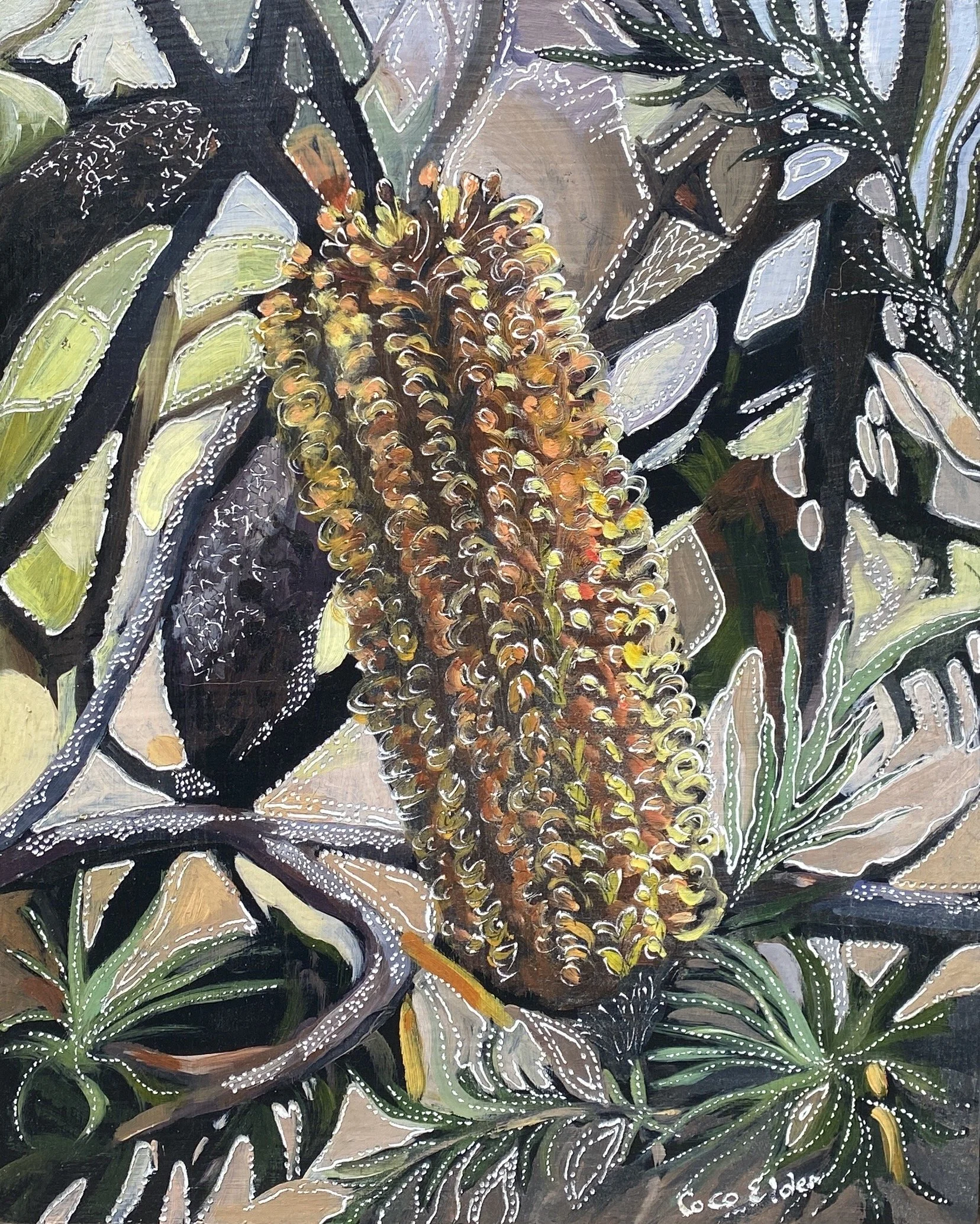 Coco’s unique process of carving into the oil paint initiated from an experiment that she did when she was seeking a way to incorporate another layer via gestural mark making with her paint. Inspired both by her early interest in lino carving and later watching her father carve into a wooden screen using a chain saw, Coco sought a more achievable approach using an engraving tool.