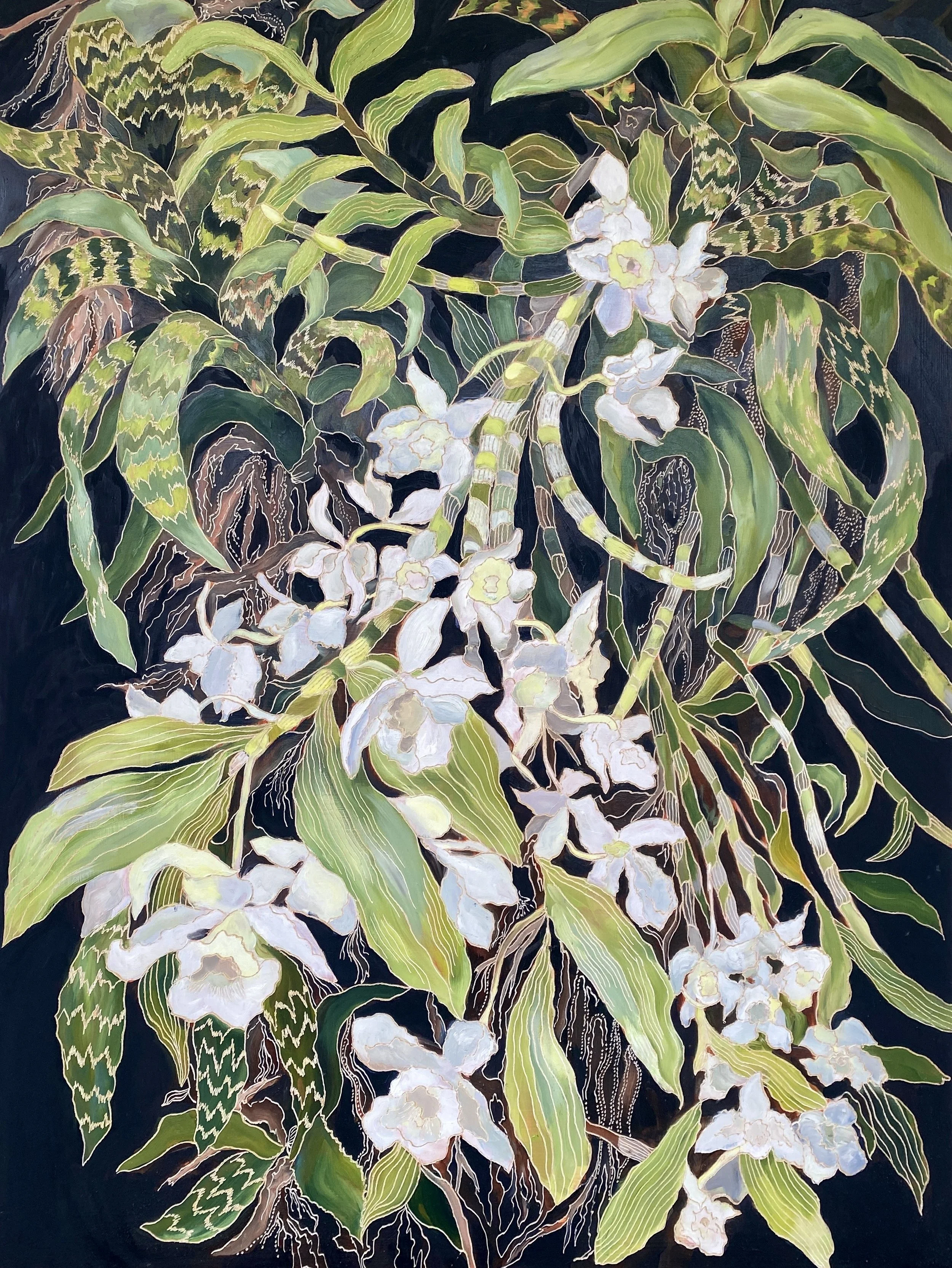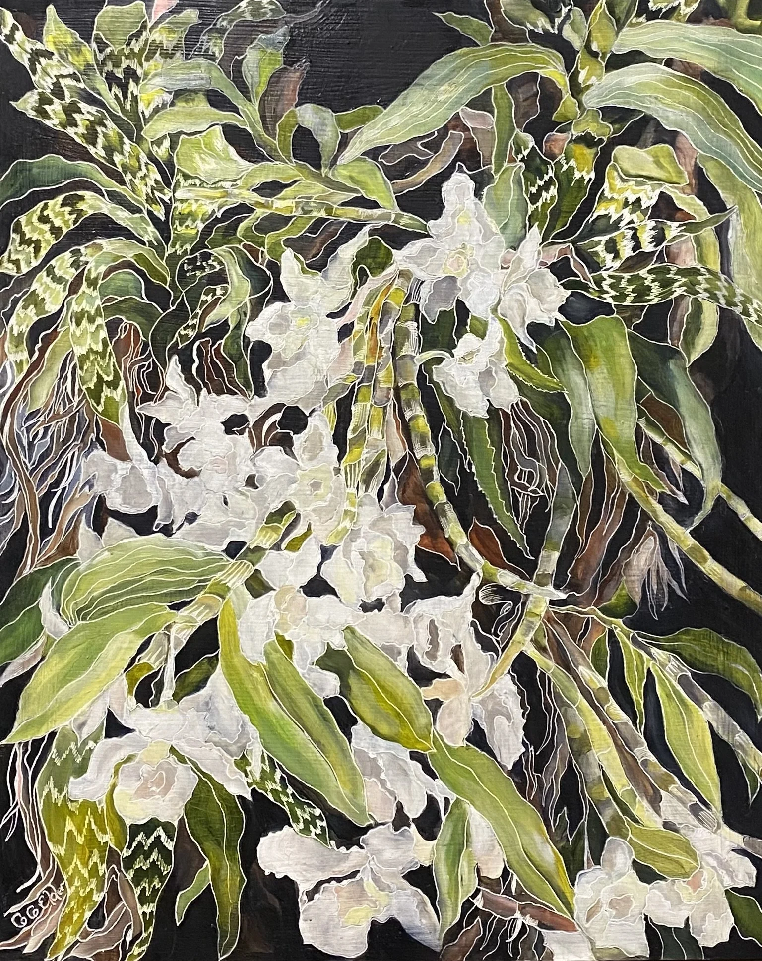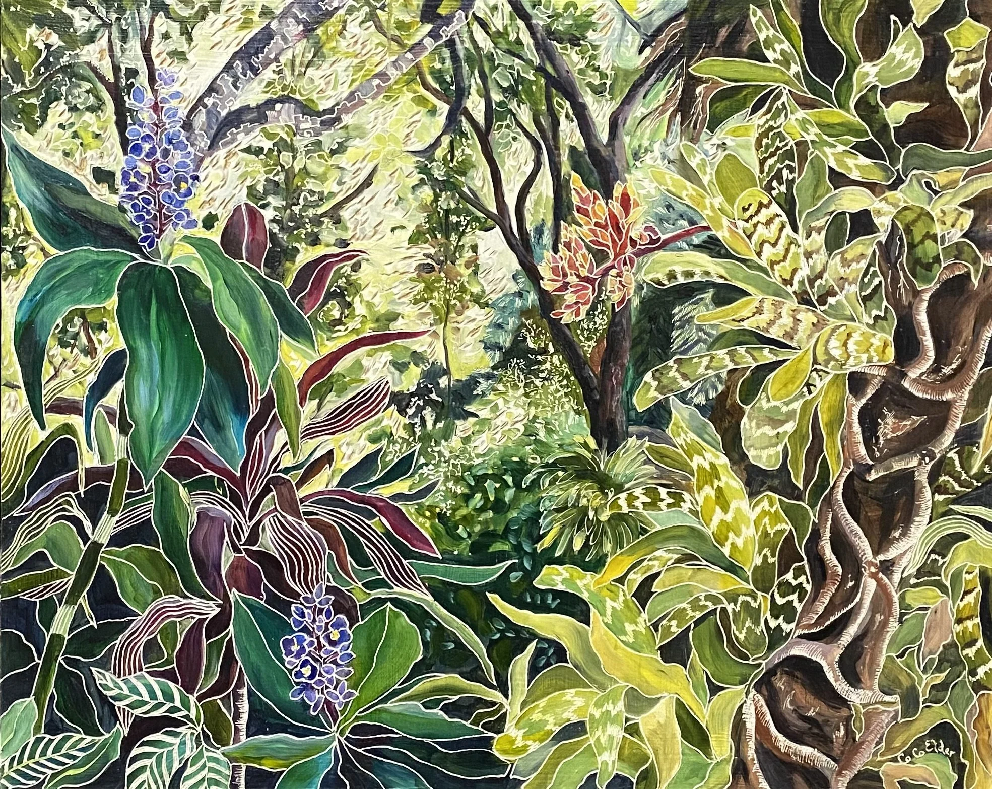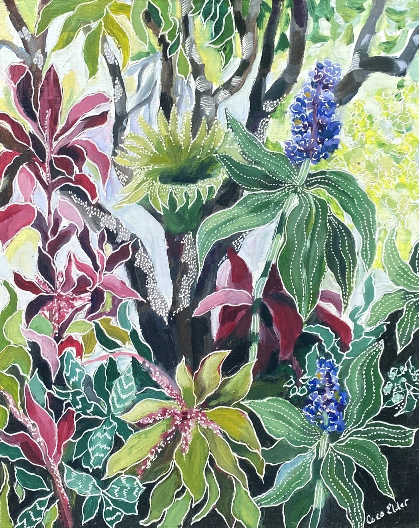 Coco’s unique process of carving into the oil paint initiated from an experiment that she did when she was seeking a way to incorporate another layer via gestural mark making with her paint. Inspired both by her early interest in lino carving and later watching her father carve into a wooden screen using a chain saw, Coco sought a more achievable approach using an engraving tool.