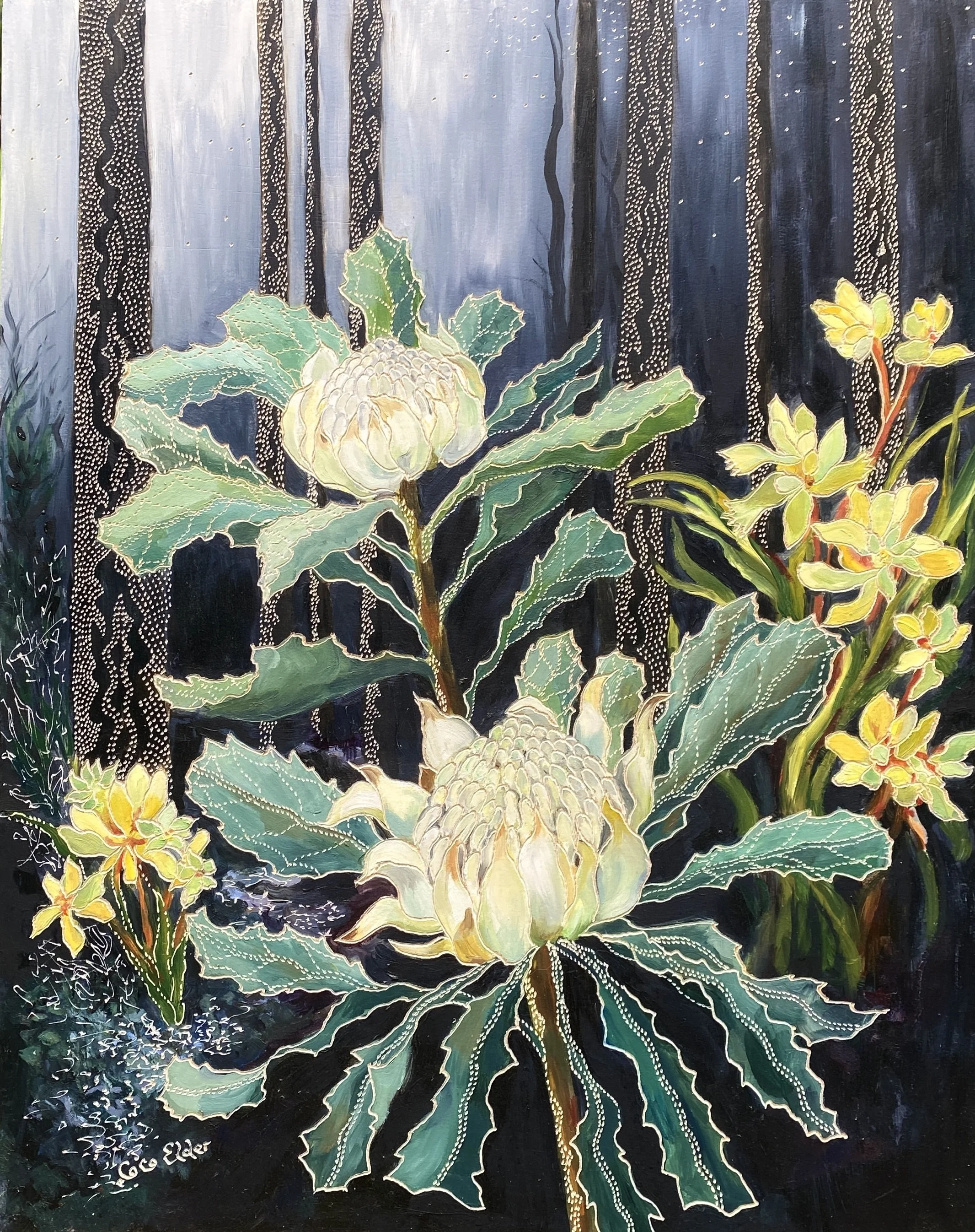 Alternate Pathways at the Never Never Medium: 93H x 154W cm Dimensions: Oil on Board Carved