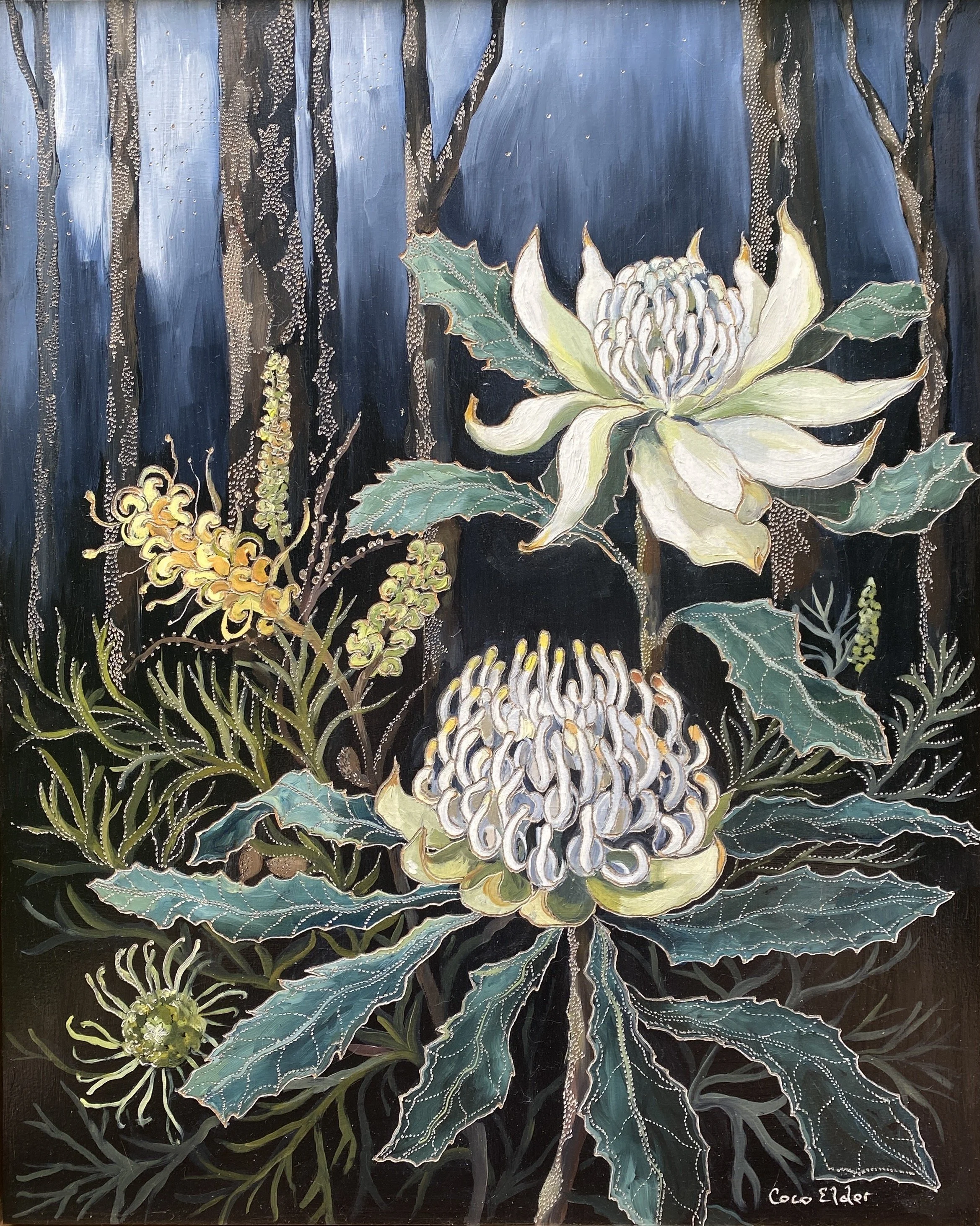 Coco’s unique process of carving into the oil paint initiated from an experiment that she did when she was seeking a way to incorporate another layer via gestural mark making with her paint. Inspired both by her early interest in lino carving and later watching her father carve into a wooden screen using a chain saw, Coco sought a more achievable approach using an engraving tool.